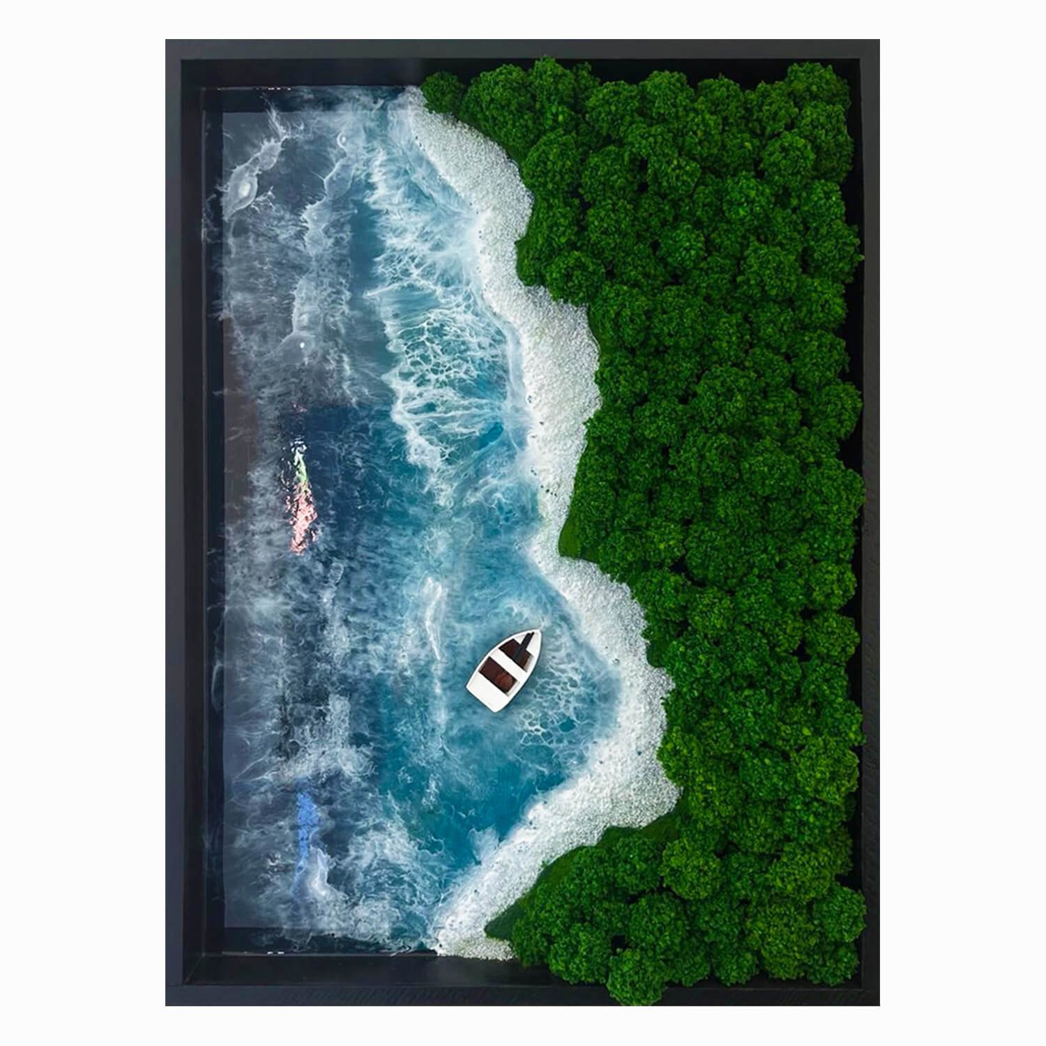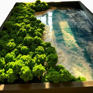 Nele usei resina epóxi pra formar o mar, areia natural tratada pra criar a praia e fiz o barquinho totalmente à mão, peça por peça. Tudo foi montado em camadas, com calma, porque na época eu ainda estava descobrindo meu processo e talvez seja por isso que esse quadro tenha tanta verdade nele.