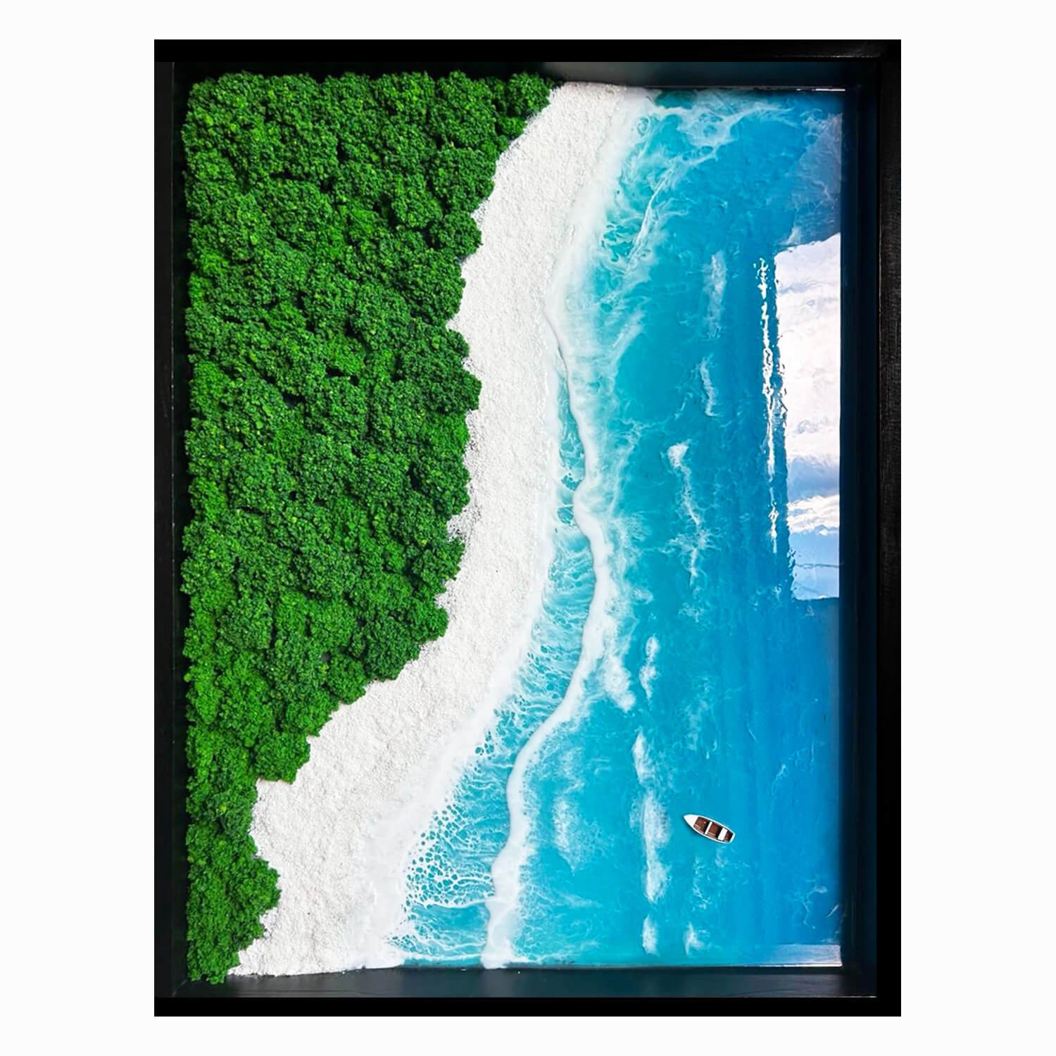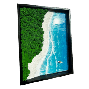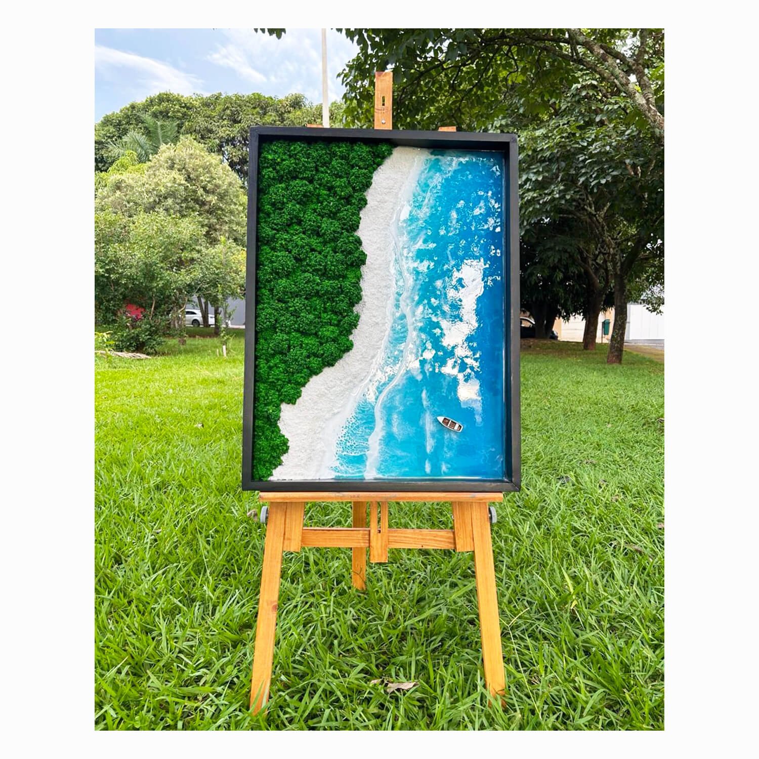 Trabalhei com resina epóxi pra criar o mar azul e as ondas, usei areia natural tratada, árvores artesanais feitas à mão e o barquinho miniatura flutuando na resina. Tudo construído por camadas, com cada detalhe colocado manualmente pra deixar a cena realista e cheia de profundidade.